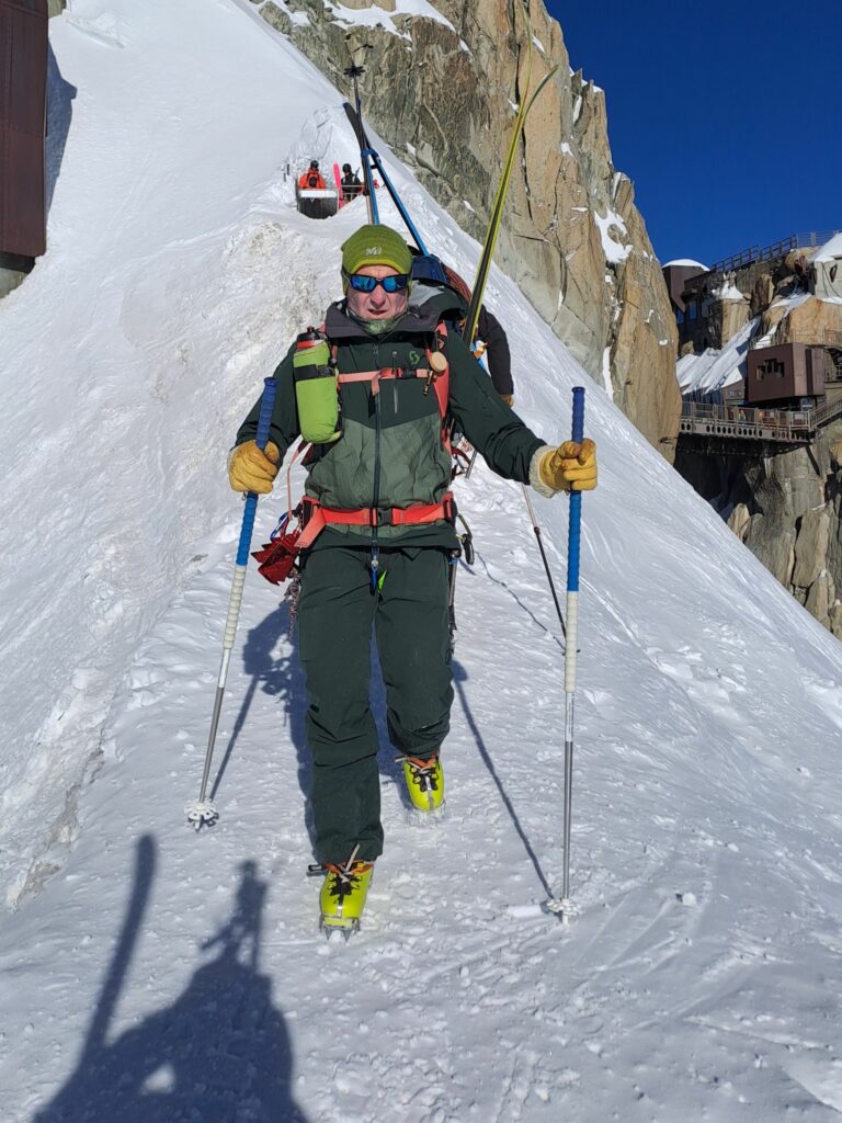 Réveil 5h30 pour être à l’heure à Chamonix et retrouver Yuji. Nous prenons les billets pour être dans la première benne de 7h30 où se trouvent à la fois des skieurs pour le Mont Blanc et des alpinistes pour des voies qui sont nombreuses dans le secteur.