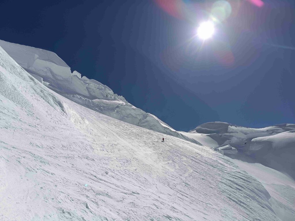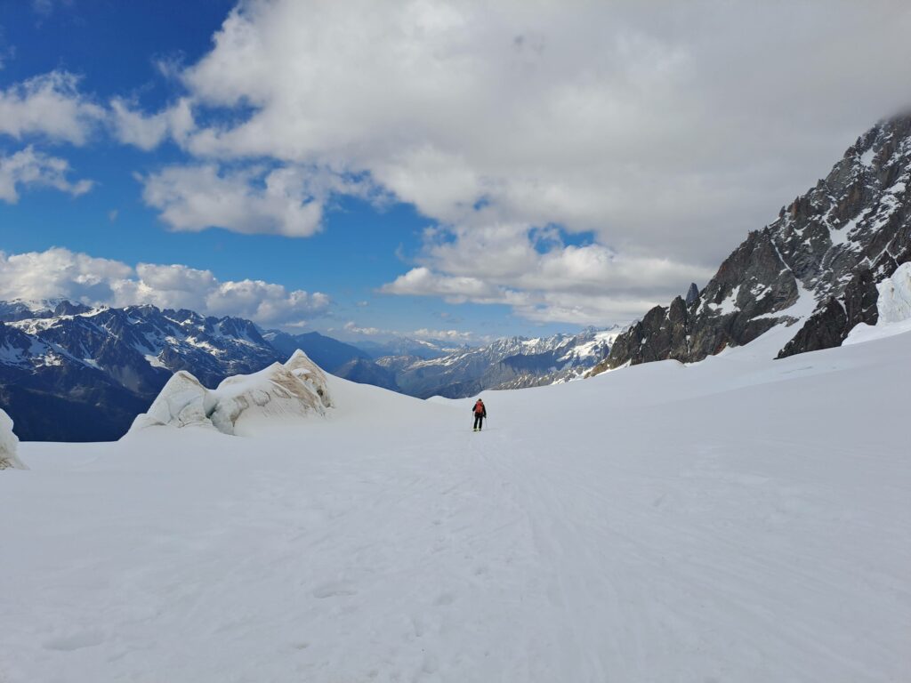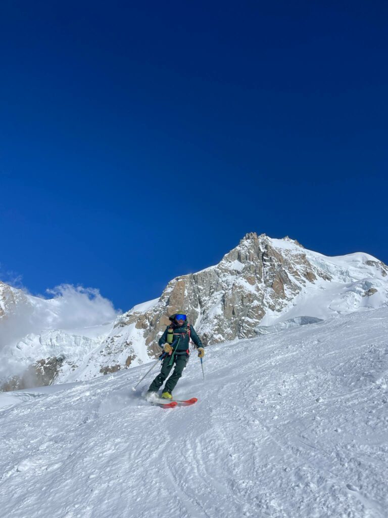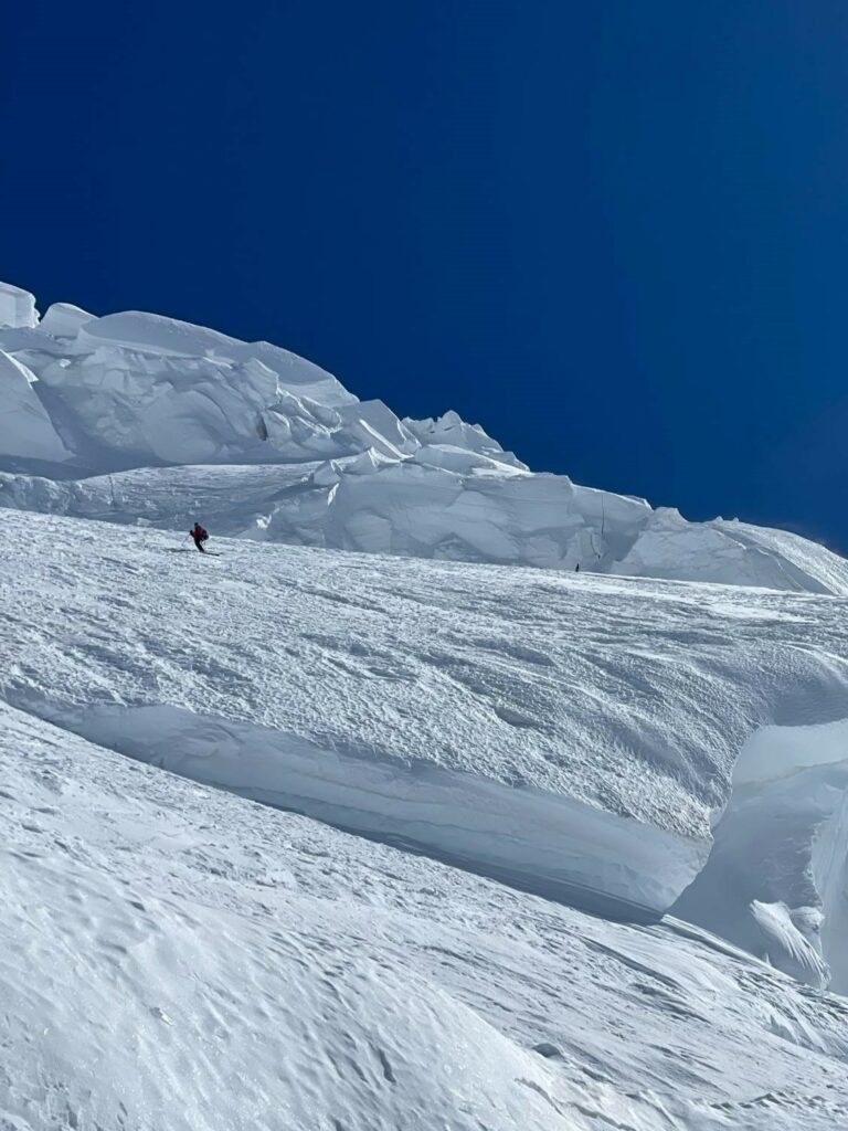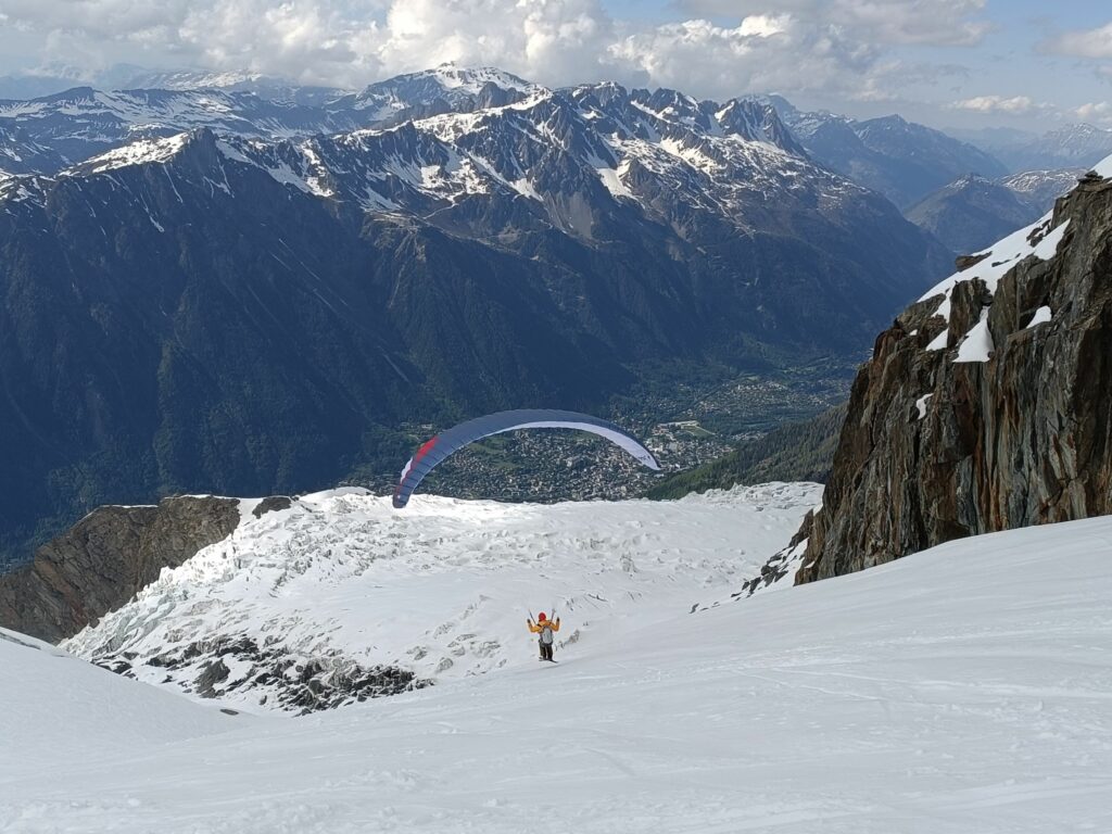 Dès les premiers virages, je sens pour ma part que cela ne va pas être une descente « rando » car il me manque un peu d’oxygène dans les muscles certainement dû à l’altitude. Sensation jamais ressentie… Cela n’enlève pas à la beauté de l’endroit et la grandiosité de ce secteur. Par ma relative « lente » descente dont Yuji et Philippe n’en revienne pas (première fois qu’il me voit descendre aussi doucement…😊). Tout le monde profite de ma vitesse « escargot » pour s’émerveiller de la beauté de cette immensité glaciaire s’en pour autant négliger la sécurité car un passage dans le secteur des Grandes Montées nous rappelle que des séracs de la taille d’un immeuble peuvent se détacher… Bon an mal an, nous arrivons au refuge des Grands Mulets (3051m) où nous allons quitter Yuji car lui va finir la descente en parapente jusqu’à Chamonix alors que nous nous allons vers un temps de retour inconnu… Nous regardons Yuji s’envoler. Pour Philippe et moi, c’est direction la Jonction en skis. Je suis agréablement surpris de l’enneigement sur le passage de la Jonction. Les « trous » sont encore bien bouchés. J’appréhendais un peu ce passage qui peut être délicat à cette époque.