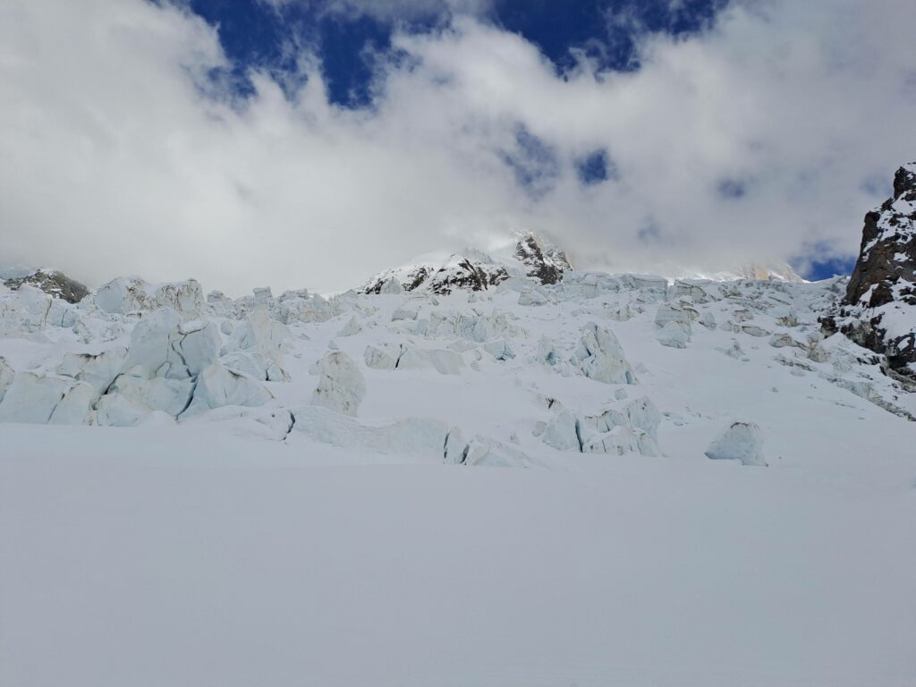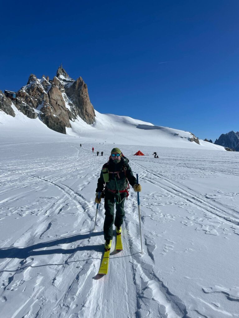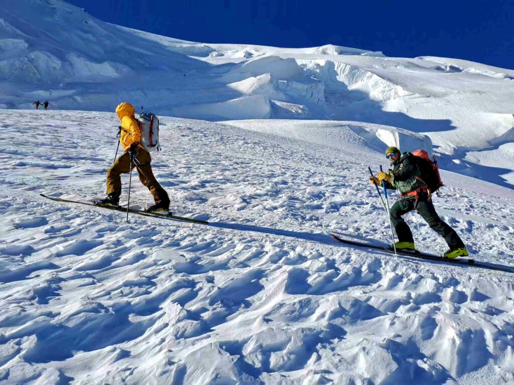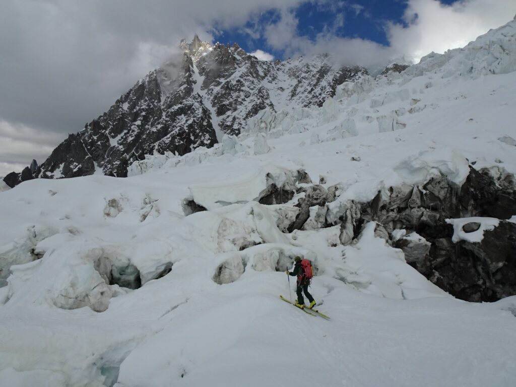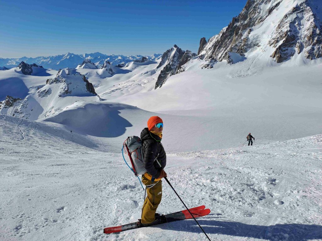 Dès les premiers virages, je sens pour ma part que cela ne va pas être une descente « rando » car il me manque un peu d’oxygène dans les muscles certainement dû à l’altitude. Sensation jamais ressentie… Cela n’enlève pas à la beauté de l’endroit et la grandiosité de ce secteur. Par ma relative « lente » descente dont Yuji et Philippe n’en revienne pas (première fois qu’il me voit descendre aussi doucement…😊). Tout le monde profite de ma vitesse « escargot » pour s’émerveiller de la beauté de cette immensité glaciaire s’en pour autant négliger la sécurité car un passage dans le secteur des Grandes Montées nous rappelle que des séracs de la taille d’un immeuble peuvent se détacher… Bon an mal an, nous arrivons au refuge des Grands Mulets (3051m) où nous allons quitter Yuji car lui va finir la descente en parapente jusqu’à Chamonix alors que nous nous allons vers un temps de retour inconnu… Nous regardons Yuji s’envoler. Pour Philippe et moi, c’est direction la Jonction en skis. Je suis agréablement surpris de l’enneigement sur le passage de la Jonction. Les « trous » sont encore bien bouchés. J’appréhendais un peu ce passage qui peut être délicat à cette époque.