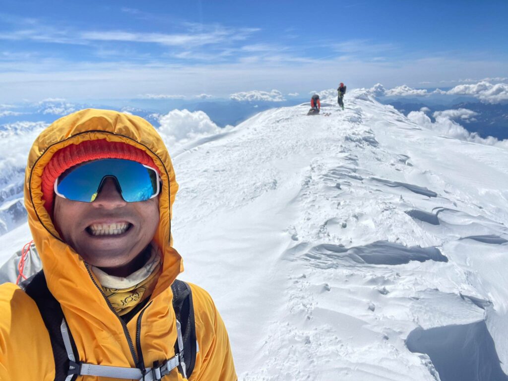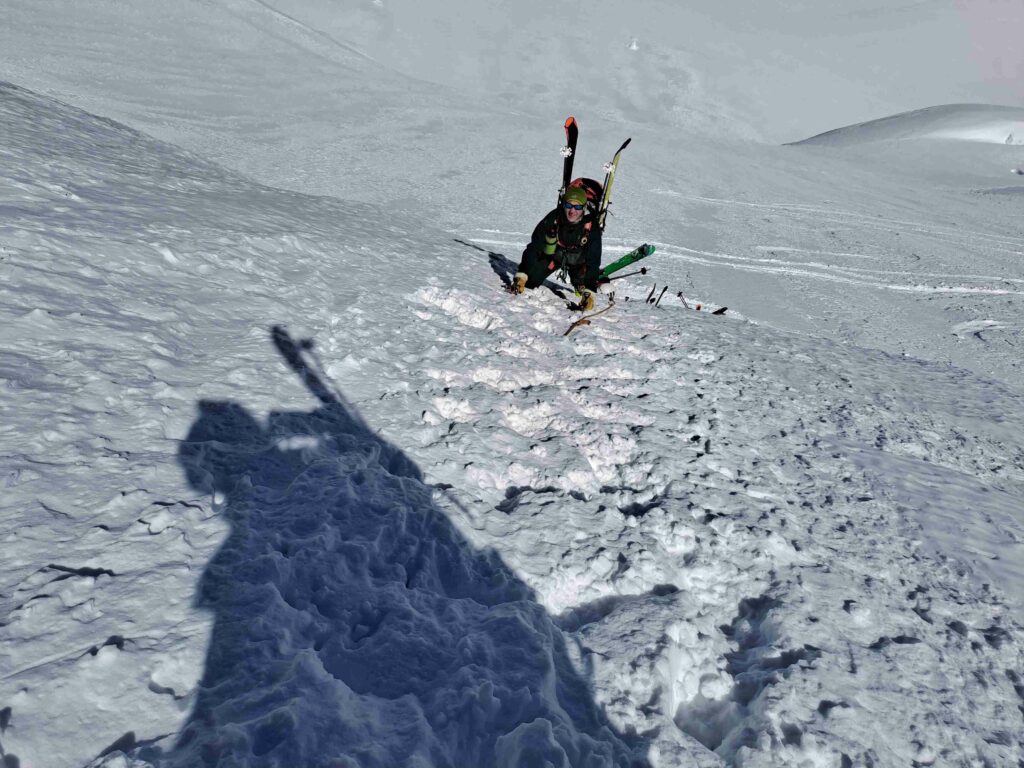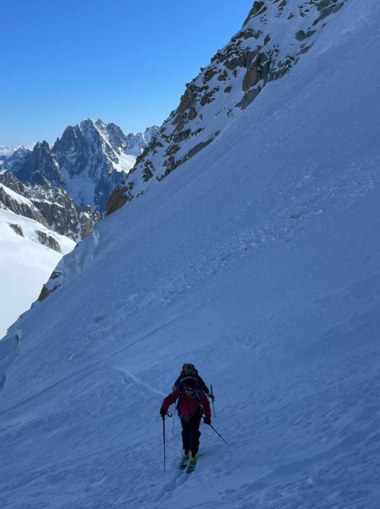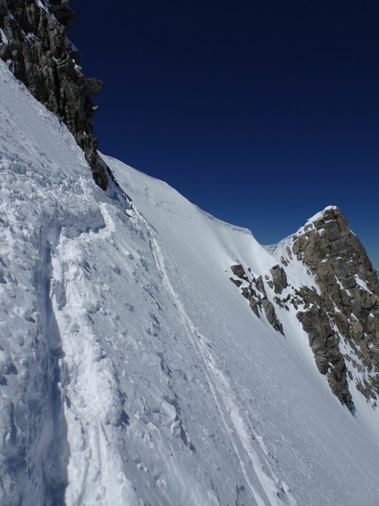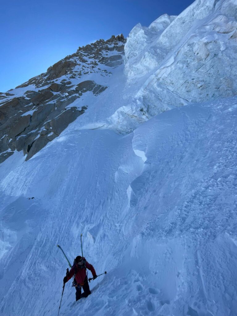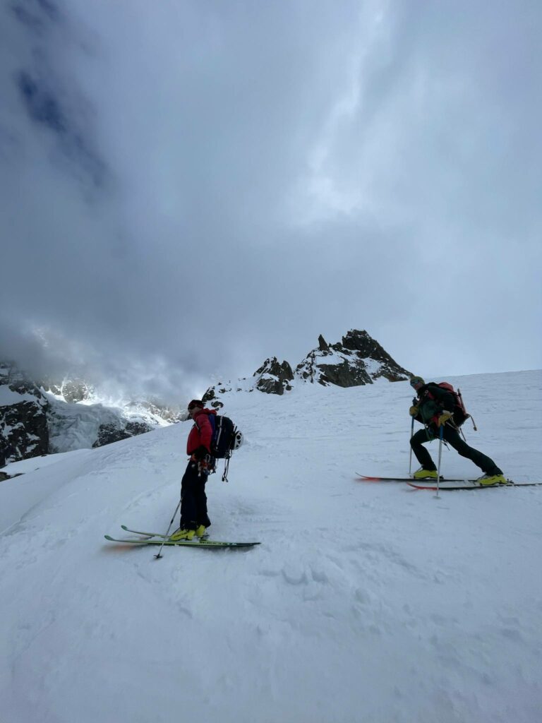 La deuxième étape consiste à glisser au col Maudit (4029m) pour ensuite attaquer la montée vers le col du Mont Maudit (4350m). Les 300 mètres de dénivelé se fera d’abord skis aux pieds jusqu’à la côte 4180, bloqués par une rimée qui nous obligera à mettre les crampons. Même si la rimée fait moins de 3 mètres, elle nous impose du fait de sa verticalité à avoir deux piolets, matériel que nous avions (bien renseignés par la gardienne du refuge des Cosmiques)… Si nous n’en avions eu qu’un, un « bienveillant » avait placé à demeure une corde pour de « l’artif ». Pour Philippe, c’était une première ce type de passage. La rimée franchie, nous gardons les skis sur le sac pour continuer jusqu’au col car la pente est trop forte pour remettre les skis aux pieds. Environ deux heures après l’Epaule du Tacul, nous arrivons au col. Dans cette montée, Yuji nous a un peu distancé mais nous attend quand même au col de la Brenva (4314m) avant d’attaquer la troisième étape de l’ascension, à savoir le franchissement du Mur de la Côte (4470m) pour finir ensuite sur une longue distance à cette altitude jusqu’au sommet (4808m). A partir de là, le vent se met à forcir (environ 40km/h) et l’altitude se fait vraiment sentir surtout pour Philippe et moi non acclimatés… Pour Yuji, ça semble beaucoup moins dur car on le voit s’éloigner de plus en plus rapidement. Nous ne le reverrons plus jusqu’à la descente… 😊 Les quelques mètres de la partie finale du Mur de la Côte légèrement glacée nous oblige à remettre les skis sur le sac… Nous remettons les skis au pied pour attaquer les 320 derniers mètres de dénivelé jusqu’au sommet avec un vent de plus en plus fort. Après 170 mètres de montée, nous rejoignons l’épaule terminale qui mène au sommet mais aussi à la « porte » d’accès à la face Nord pour descendre. Après réflexion sur le temps que j’estime pour aller jusqu’au sommet, les conditions de vent (plus de 50 km/h) et également le temps de descente jusqu’à Chamonix (pas de nuit réservée au refuge des Grands Mulets et vu l’heure, plus de descente possible en téléphérique depuis la gare intermédiaire du Plan de l’Aiguille à 2300m), je fais le choix de renoncer à la côte 4650. Frustrant mais Philippe comprend ma décision. « Dépeautage » et mode descente fait, prêts à attaquer la descente, nous voyons Yuji nous rejoindre après qu’il ait fait le sommet. Chose à laquelle je ne m’attendais pas car il nous avait vraiment distancé. Ça me conforte dans ma décision. Nous allons donc descendre tous ensemble par la face Nord.