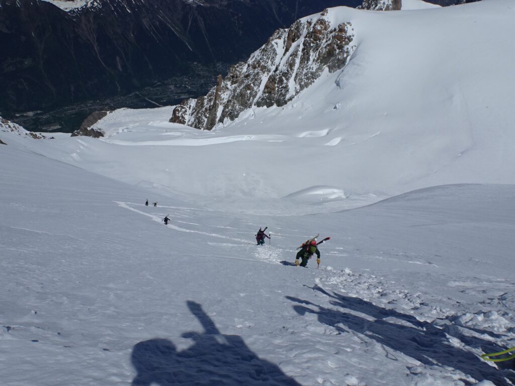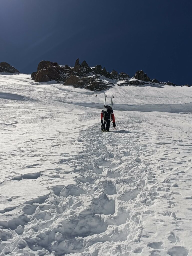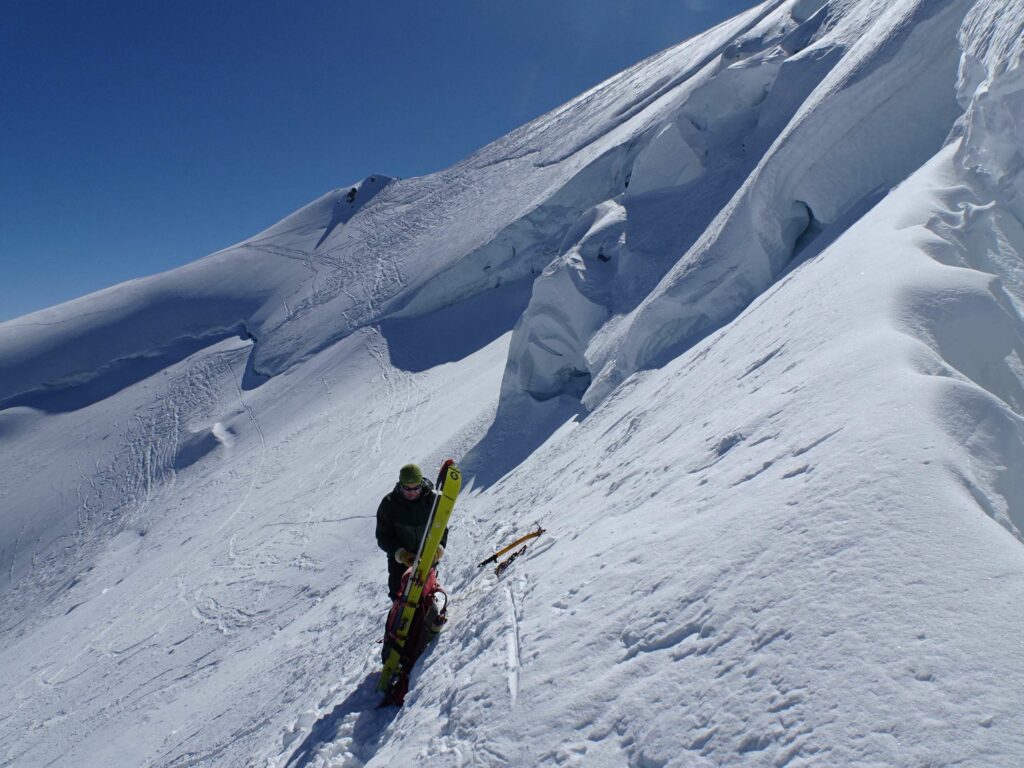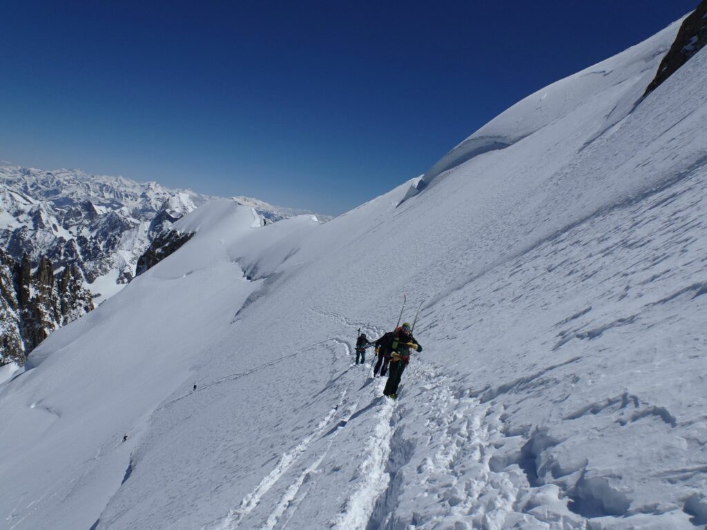 Nous arrivons à l’Aiguille du Midi (3800m) où à 8h00 nous attaquons par descendre l’arête skis sur le sac (classique pour les skieurs qui font la fameuse Vallée Blanche en hiver) qui permet d’atteindre le plat (3680m) où nous chaussons pour aller vers le col du Midi (3520m) pour démarrer l’ascension du Mont Blanc du Tacul, plus exactement rejoindre l’Epaule Ouest (4100m). La montée se fera en combinant skis aux pieds et skis sur le sac en fonction du terrain. L’épaule est atteinte 2h45mn après notre départ de l’Aiguille.