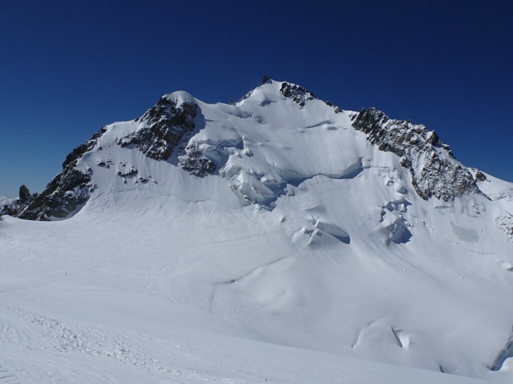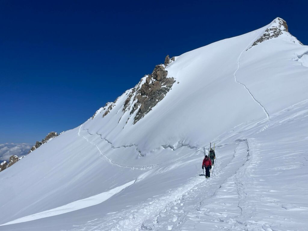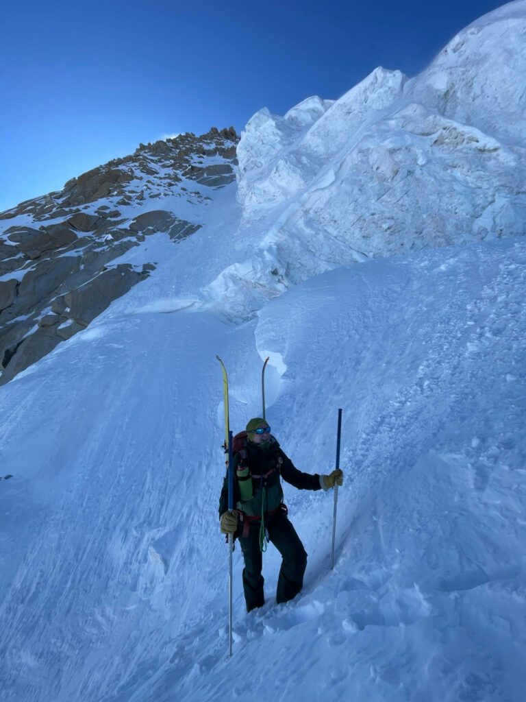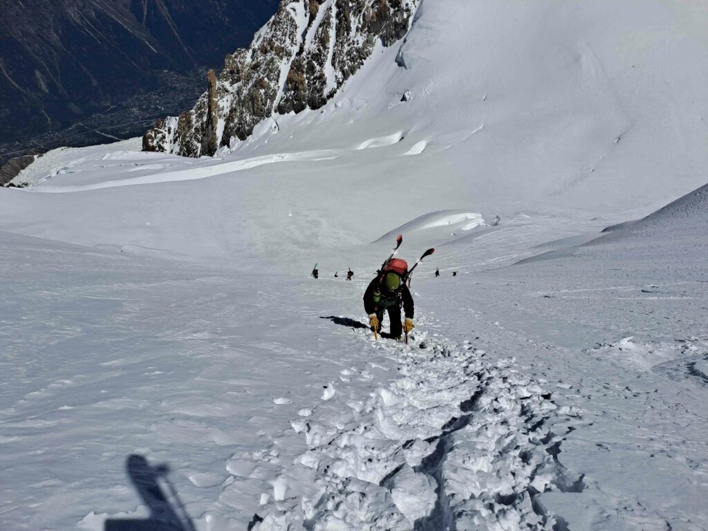 Nous arrivons à l’Aiguille du Midi (3800m) où à 8h00 nous attaquons par descendre l’arête skis sur le sac (classique pour les skieurs qui font la fameuse Vallée Blanche en hiver) qui permet d’atteindre le plat (3680m) où nous chaussons pour aller vers le col du Midi (3520m) pour démarrer l’ascension du Mont Blanc du Tacul, plus exactement rejoindre l’Epaule Ouest (4100m). La montée se fera en combinant skis aux pieds et skis sur le sac en fonction du terrain. L’épaule est atteinte 2h45mn après notre départ de l’Aiguille.